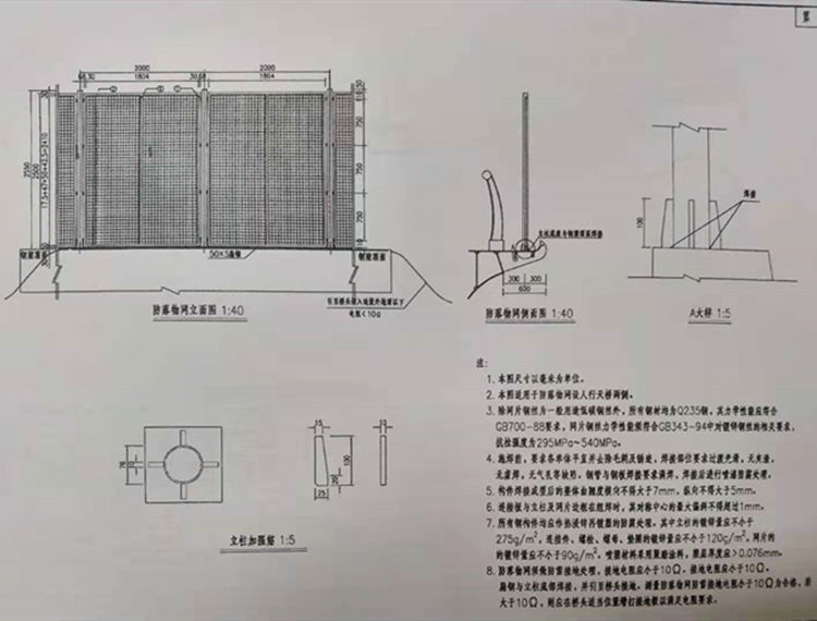 3.防落物網(wǎng)除網(wǎng)片鋼絲為一般用途低碳鋼絲外,所有鋼材均為Q235鋼,其力學性能應符合GB700-88要求,網(wǎng)片鋼絲力學性能須符合GB343-94中對鍍鋅鋼絲的相關要求,抗拉強度為295MPa~ 540MPa。