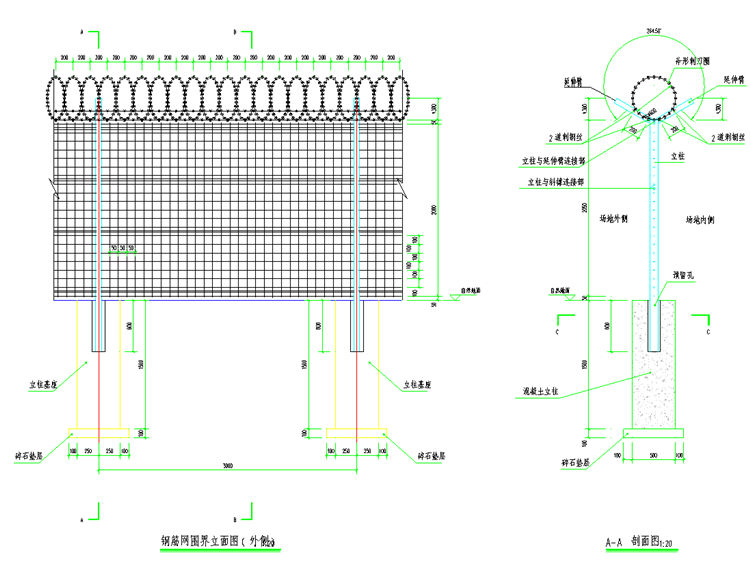 7、圖中立柱頂部應(yīng)加蓋柱帽,立柱與鋼筋網(wǎng)、立柱與延伸臂的連接采用防盜形式并經(jīng)防腐處理。