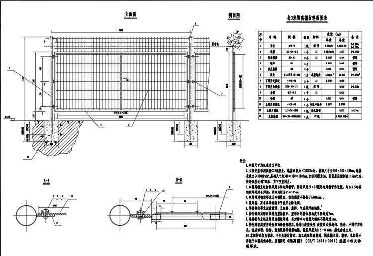 3、焊接網(wǎng)隔離柵基礎(chǔ)部分根據(jù)各地區(qū)地質(zhì)地貌的結(jié)構(gòu)和復(fù)雜程度的差異,施工的過(guò)程中要針對(duì)不同地質(zhì)狀況實(shí)施專業(yè)技術(shù),基礎(chǔ)部分根據(jù)實(shí)際情況,一般地質(zhì)如粉土,沙土等,地基承載力<300KPa,采用300×300×1000 的基礎(chǔ),以達(dá)到其基礎(chǔ)的穩(wěn)定;特殊地質(zhì)如山區(qū)段,地基承載力≥300KPa,采用300×300×500 的基礎(chǔ)。說(shuō)明中焊接網(wǎng)隔離柵樣式及參數(shù)僅為推薦,不作為指定樣式,施工選取焊接網(wǎng)隔離柵時(shí),焊接網(wǎng)隔離柵立柱、橫梁、孔徑等不得低于本圖提供參數(shù),且需滿足《隔離柵》(GB/T 26941-2011)規(guī)范中相關(guān)參數(shù)要求。