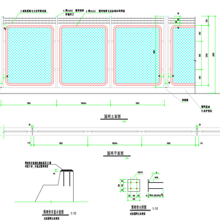 4、圍網其他注意事項:圖中尺寸單位在本設計說明及圖紙中均以毫米計,標高以米計;圖中未注明事宜均按現(xiàn)行建筑工程及驗收技術規(guī)范進行施工;施工中應注意與各專業(yè)圖紙配合并做好預埋件及預留孔洞。