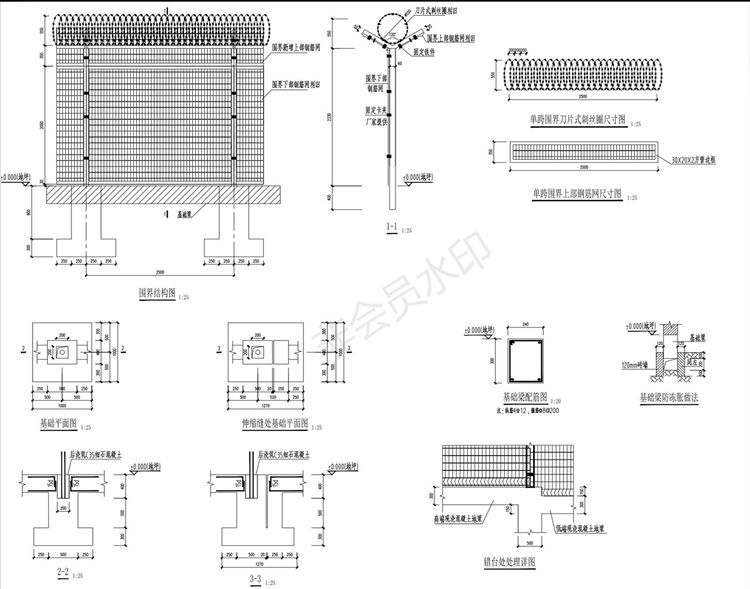 1.拆除并原址新建的圍界具體位置及長度見總圖,新建鋼筋網圍界高度為2.850米,立柱間距2.500米,下部鋼筋網片利舊。