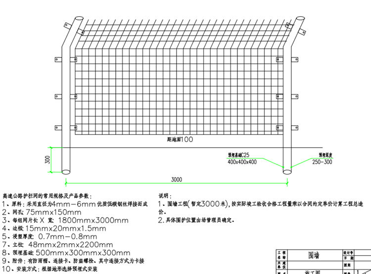 3、網(wǎng)片高1800mm,網(wǎng)片寬3000mm;