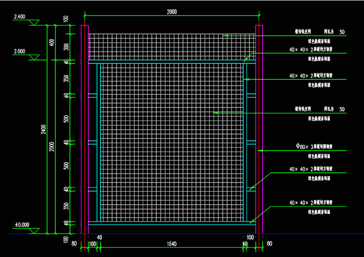 2、邊框,40*40*2mm厚鍍鋅方鋼管,綠色氟碳漆飾面。