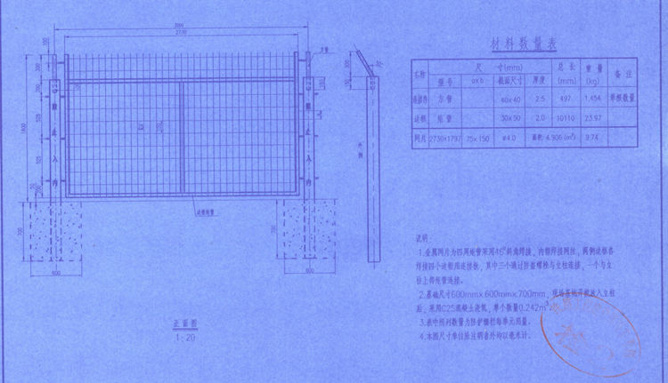 金屬網(wǎng)片采用Q235矩管邊框,規(guī)格30mm*50mm,矩管厚度2.0mm;內(nèi)部網(wǎng)絲采用HPB300 ¢4.0mm高線冷拔鋼絲,規(guī)格75mm*150mm。