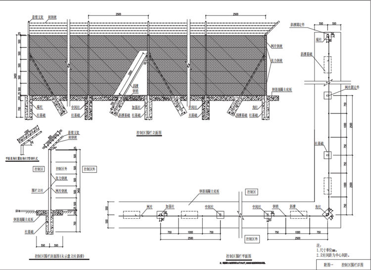 網(wǎng)片應(yīng)采用縱向編織,網(wǎng)孔尺寸為50mmX50mm,網(wǎng)面高度為2.5m,其底部彎曲,頂部垂直分開,端部應(yīng)咬合在一起,底部高出底板2.5cm。網(wǎng)片上應(yīng)有六根張力鋼絲,張力鋼絲之間的距離為50cm。下部張力鋼絲應(yīng)穿入防腐鋼銷,鋼銷固定于鋼筋混凝土底板上或錨固于路面上。每兩根立柱之間應(yīng)有兩個(gè)防腐鋼銷,鋼銷的標(biāo)準(zhǔn)間距為1. 0m。網(wǎng)片用直徑為4mm,間距為30cm的不銹鋼夾連接到張力鋼絲的外側(cè)。