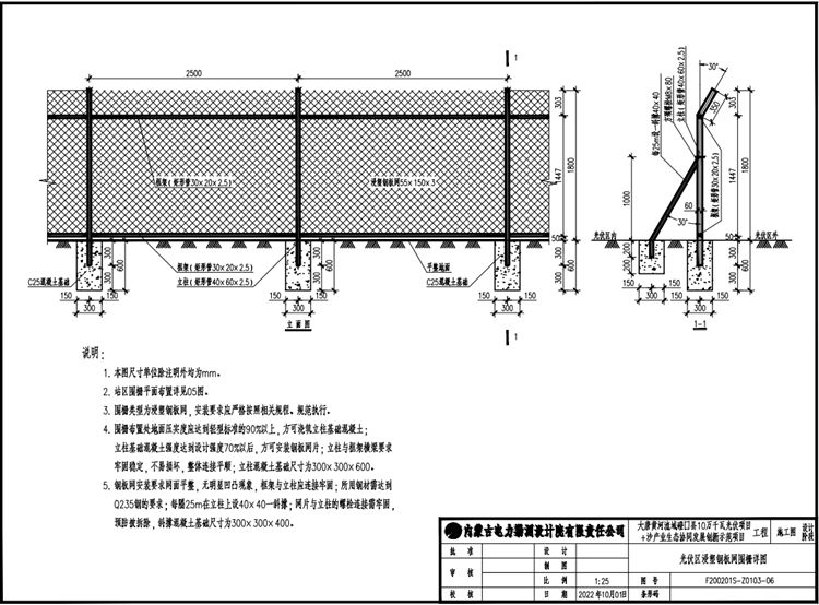 4.光伏項目鋼板網圍柵布置處地面壓實度應達到輕型標準的90%以上,方可澆筑立柱基礎混凝土;立柱基礎混凝土強度達到設計強度70%以后,方可安裝鋼板網片;立柱與框架橫梁要求牢固穩(wěn)定,不易損壞,整體連接平順;立柱混凝士基礎尺寸為300x300x600。