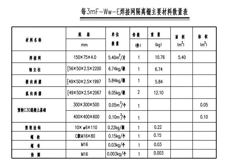 本圖尺寸均以毫米為單位,比例1:30。焊接網(wǎng)隔離柵每隔99m在立柱兩側(cè)加斜撐,每198m或隔離柵改變方向處在立柱三個方向加斜撐。焊接網(wǎng)采用4.0mm(防腐處理)的鋼絲,網(wǎng)孔規(guī)格150X75mm。立柱選用56X50X2.5冷彎等邊槽鋼,斜撐選用49X50X2.5冷彎等邊槽鋼。隔離柵設(shè)置于公路用地界內(nèi)側(cè)0.3m 處,地形有起伏時,片網(wǎng)隔離柵按階梯形設(shè)置;片網(wǎng)隔離柵遇到≤3m 的溝渠或涵洞時,可直接跨過,但在跨躍處需設(shè)置異形網(wǎng)片,防止人或動物由此進入。每段隔離柵的起終點或隔離柵需要斷開的地方,應(yīng)針對不同的情況做端頭圍封,在隔離柵需改變方向的地方,應(yīng)做拐角處理。焊接片網(wǎng)隔離柵采用熱浸鍍鋅涂塑處理,螺栓、螺母、墊圈等連接件的鍍鋅量為120g/㎡,立柱等構(gòu)件為275g/㎡,網(wǎng)片塑層厚度不小于0.3mm。立柱等鋼構(gòu)件塑層厚度不小于76μm,焊接網(wǎng)隔離柵的鋼構(gòu)件均應(yīng)作熱浸鍍鋅后鍍塑處理。鍍鋅時應(yīng)符合下表的規(guī)定,熱浸鍍鋅所用的鋅應(yīng)為符合《公路交通工程鋼構(gòu)件防腐技術(shù)條件》中引用的 GB/T470中所規(guī)定的特1號或1號鋅錠,鍍鋅后再浸塑或噴塑,顏色為果綠色。所有鋼構(gòu)件均應(yīng)進行熱浸鍍鋅涂塑處理,螺栓、螺母、墊圈等連接件的鍍鋅量為120g/㎡,其它構(gòu)件為275g/㎡,網(wǎng)片塑層厚度不小于0.3mm。其它鋼構(gòu)件涂塑層厚度不小于76μm。