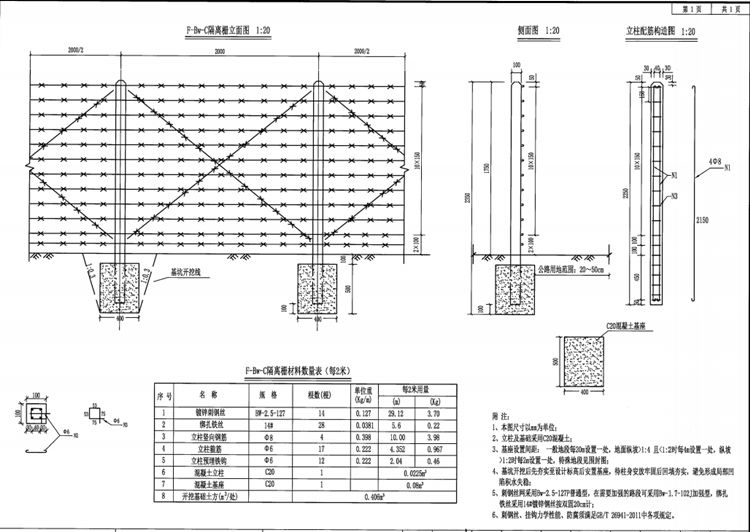 5、剌鋼絲網(wǎng)采用Bw-2.5-127P普通型,在需要加強(qiáng)的路段可采用Bw-1.7-102J加強(qiáng)型,綁扎鐵絲采用14#鍍鋅鋼絲按雙固20cm計(jì)。