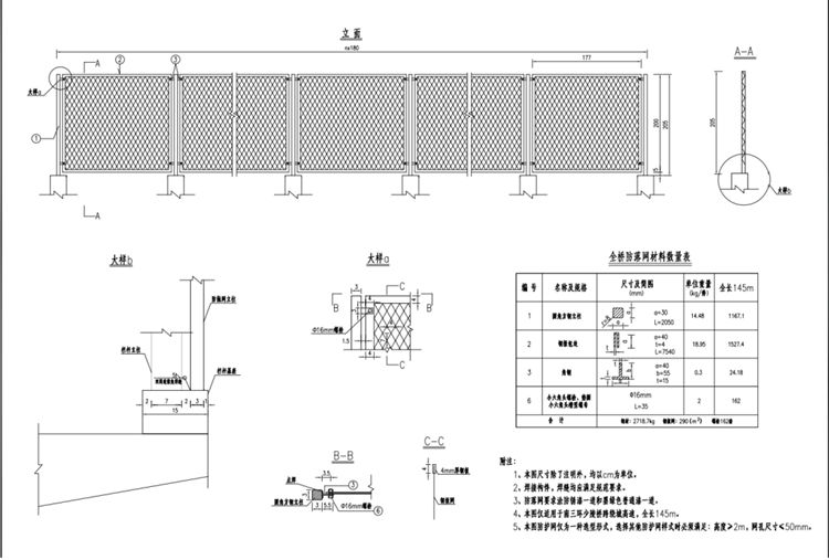 6、本圖防護網(wǎng)僅為一種選型形式,選擇其他防護網(wǎng)樣式時必須滿足:高度>2m,網(wǎng)孔尺寸≤50mm。