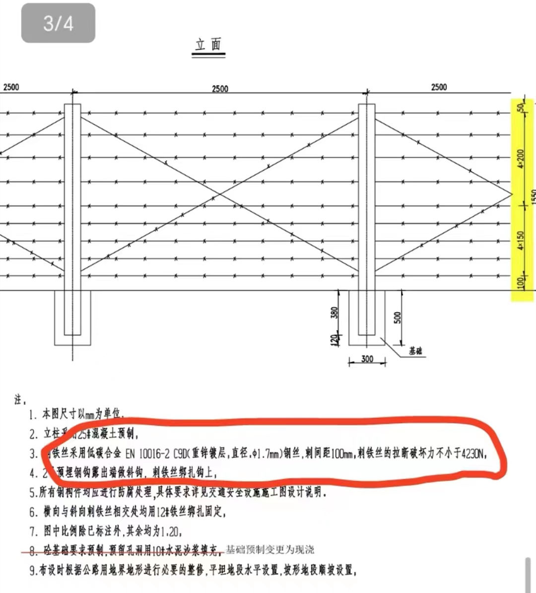 3、刺鐵絲采用低碳合金EN10016-2C90(重鋅鍍層,Φ1.7mm)鋼絲,刺間距100mm,刺鐵絲的拉斷破壞力不小于4230N。