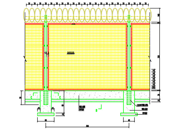 4.立柱截面尺寸為80mm×60mm×2.5mm,斜撐和延伸臂截面尺寸為50mm×50mm×2.0mm,鋼筋網(wǎng)片網(wǎng)格尺寸為100mm×50mm(中到中),刺刀圈直徑不小于600mm。