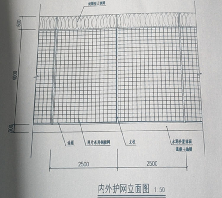 1、本工程為中度戒備監(jiān)獄。圍墻內(nèi)側(cè)5.0m及外側(cè)10.0m處應(yīng)各設(shè)一道高度不低于4.0m的防攀爬金屬網(wǎng)。