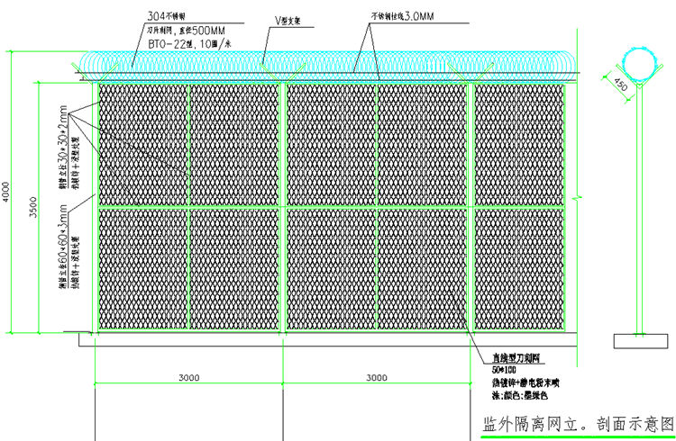 10、監(jiān)獄金屬網(wǎng)墻的頂部應(yīng)設(shè)道蛇腹型刀刺網(wǎng), 蛇腹型刀刺網(wǎng)材質(zhì)宜為304不銹鋼, 刀片形式宜為BT0-22。