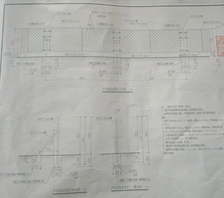 4、鋼絲網(wǎng)圍欄立柱采用φ48x2.0mm圓管,間隔3m一個立柱,立柱地面高1.8m,埋深0.39m。
