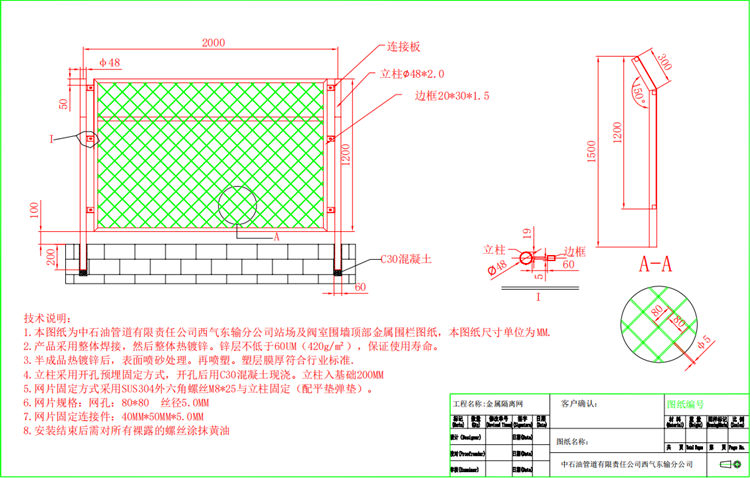1.本圖紙為中石油管道有限責(zé)任公司西氣東輸分公司站場(chǎng)及閥室圍墻頂部金屬隔離網(wǎng)圖紙,本圖紙尺寸單位為MM。