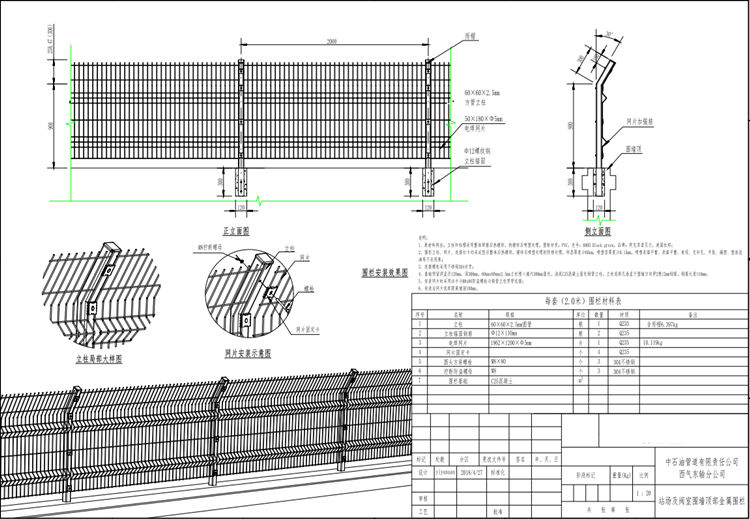5、金屬防護(hù)欄安裝網(wǎng)片時(shí)采用扣卡與M8x80防盜螺栓與鋼管立柱貫穿連接。