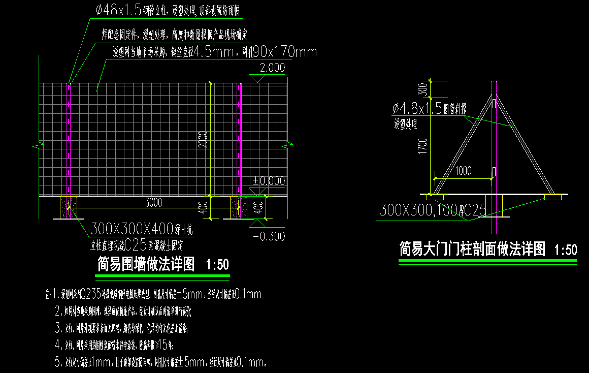 5、浸塑網(wǎng)圍欄立柱尺寸偏差正1mm,柱子頂部設(shè)置防雨帽,網(wǎng)孔尺寸偏差±5mm,絲徑尺寸偏差正0.1mm。