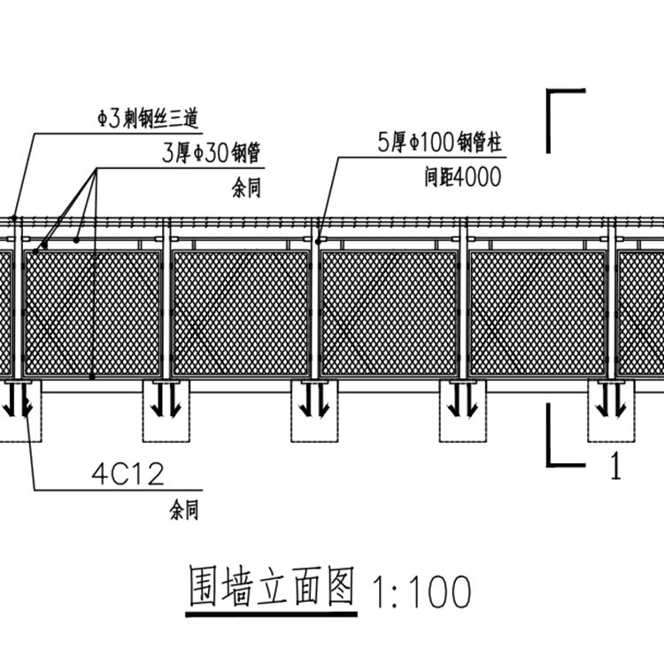 1、保稅區(qū)圍網(wǎng)立柱采用Φ100*5.0mm鍍鋅鋼管制作而成,立柱間距4000mm,立柱焊接法蘭盤,打膨脹螺絲固定立柱。