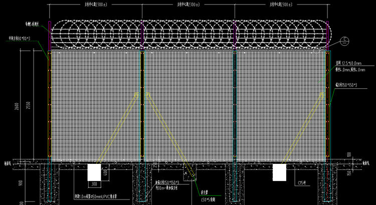(1)、防攀爬刀刺網(wǎng)立柱頂部安裝雙曲臂,曲臂成 90 度夾角,曲臂采用材質(zhì)為 Q235B 的L50*5.0mm 熱鍍鋅角鋼,鍍鋅量≥220g/㎡,角鋼長(zhǎng)度 700,角鋼表面經(jīng)高強(qiáng)附著力聚粉末靜電噴涂處理,塑層厚度≥80μm。每個(gè)曲臂上等距離預(yù)留 5 個(gè)安裝鋼刺絲孔,雙曲臂中間安裝一個(gè)φ700 熱鍍鋅刺刀圈,角鋼預(yù)留螺栓孔與立柱連接,采用