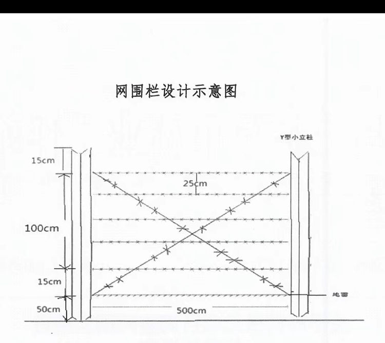 2、鍍鋅刺鐵絲防護(hù)欄使用七道刺絲(刺絲規(guī)格為帶刺雙絲合一,鍍鋅鐵絲,單絲2.4mm,雙絲4.8mm),其中五道橫絲,兩道X絲。刺間距小于6cm。 (見(jiàn)鍍鋅刺鐵絲防護(hù)欄設(shè)計(jì)示意圖)