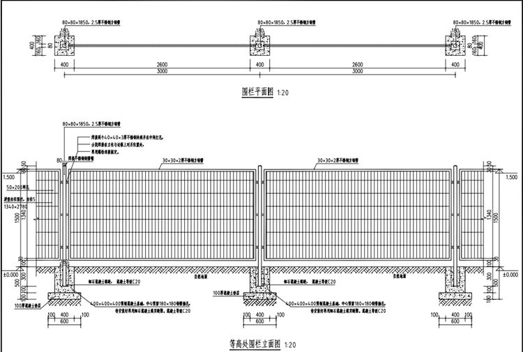 1.隔離護(hù)欄立柱為80mm*80mm*1850mm,2.5mm厚方鋼管;隔離護(hù)欄基礎(chǔ)為預(yù)制混凝土,混凝土等級(jí)為C20 ,規(guī)格400mm*400mm*400mm。隔離護(hù)欄基礎(chǔ)中心預(yù)留180mm米180mm鋼管插孔,鋼管深入混凝土基礎(chǔ)300mm , 待安裝好再用細(xì)石混凝土(混凝土等級(jí)為C20 )填實(shí)縫隙。
