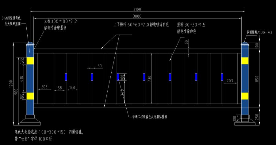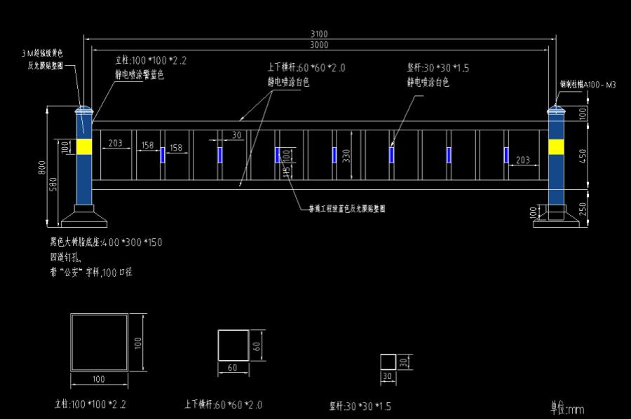 豎管 30*30*1.5mm; 四周邊框 60*60*2.0mm; 立柱 100*100*2.2mm; 帶反光膜,樹脂底座。