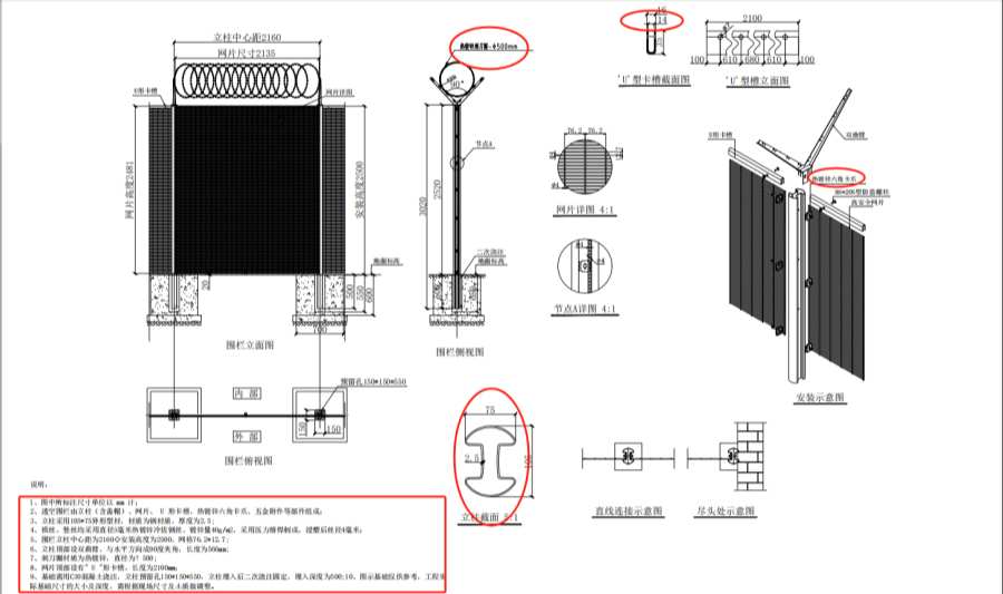 2.5m 高鋼格柵圍欄由立柱(含蓋帽)、網(wǎng)片、U 形卡槽、鍍鋅鋼六角卡爪、五金附件等部件成:立柱采用105×75 異形型材,材質(zhì)為鍍鋅鋼,厚度為2.5mm(噴涂前需保證鋼材厚度不小于 2.3mm-2.4mm),橫絲、豎絲采用聚酯侵塑后直徑4mm(浸塑前需保證絲徑不小于 3mm),顏色為綠色。熱鍍鋅冷拔鋼絲,鍍鋅量≥40g/㎡ ,采用壓力熔焊制成。圍欄立柱中心距為 2160mm,安裝高度為2500mm,網(wǎng)格為 76.2*12.7mm,立柱頂部設(shè)雙曲臂,與水平方向成90 °夾角,長(zhǎng)度為 566mm,表面熱鍍鋅,鍍鋅量>275g/㎡ ,刺刀圈材質(zhì)為熱鍍鋅鋼,直徑為φ500mm。U 形卡槽材質(zhì)為鍍鋅鋼 ,壁厚為1.0mm,做噴塑處理。