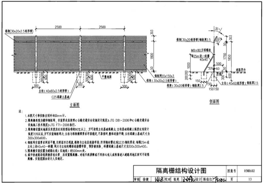 2.隔離柵類型為鍍鋅鋼板網(wǎng),安裝要求應(yīng)按照《公路交通安全設(shè)施設(shè)計(jì)規(guī)范》JTG D81-2006和《公路交通安全設(shè)施施工技術(shù)規(guī)范》JTG F71-2006執(zhí)行。