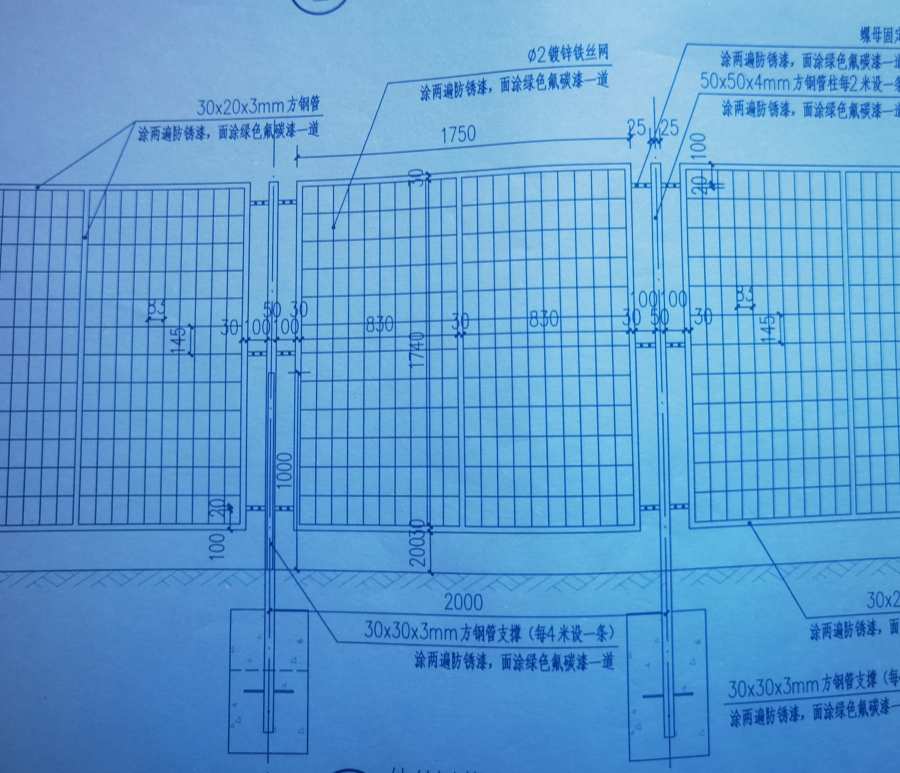 2.鍍鋅鋼網(wǎng)由φ2.0的冷拔鋼絲經(jīng)鍍塑而成,塑層厚度0.6mm,采用綠色。鍍望層必須色澤均勻、不得存在針孔、流淌堆積、粘結(jié)、燒焦等鍍塑缺陷。