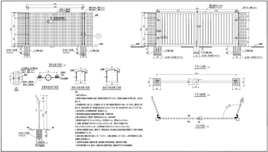 2.土質(zhì)地基:圍欄的基礎(chǔ)尺寸均為300mmX300mmX400mm(高),圍欄大門立柱基礎(chǔ)尺寸均為