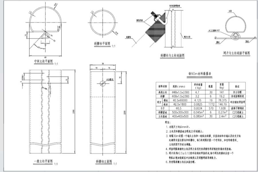 3.每30m設置一個端頭立柱和一組縱向斜撐,安裝起始和末端以及改變方向處都要安裝拉緊柱和斜捧柱,每3米間隔安置一個中間柱,如有特珠情況,立柱間距可作適當調整。