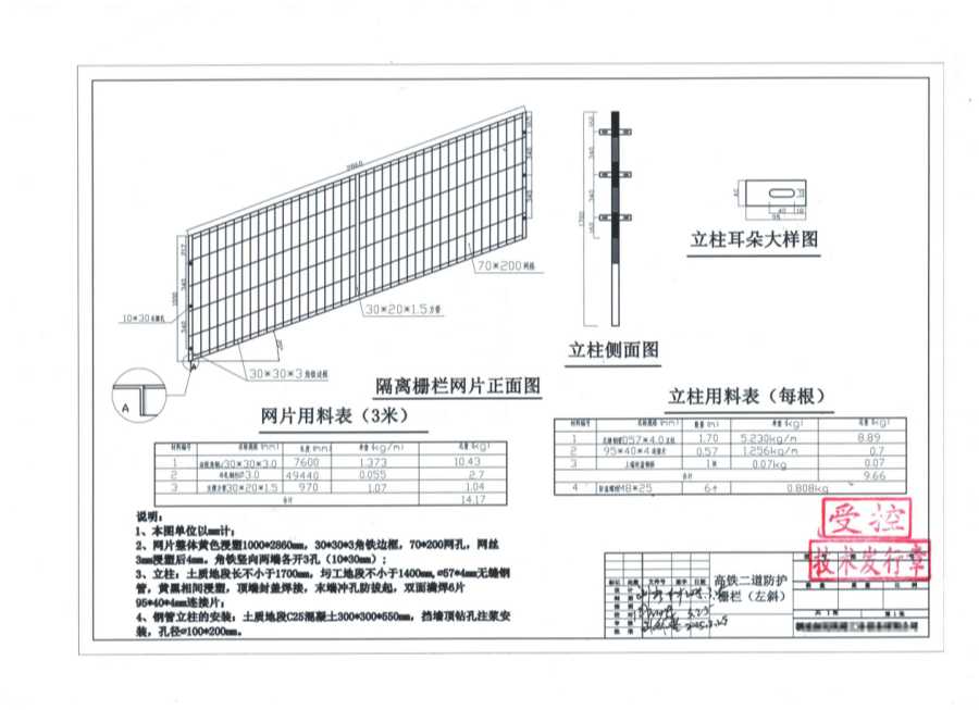 2、網(wǎng)片整體黃色漫塑1000*2860mm,30*30*3角鐵邊框,70*200網(wǎng)孔,網(wǎng)絲3mm浸塑后4mm。角鐵豎向兩端各開3孔(10*30mm)。